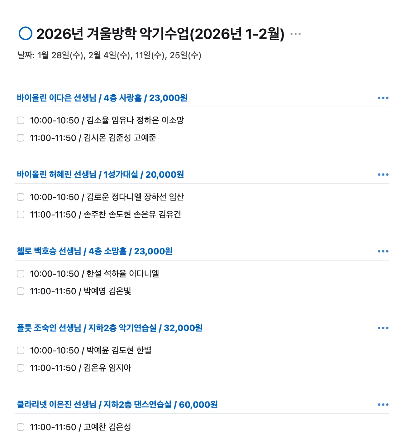 악기 종류: 바이올린, 첼로, 플룻(2학년 2학기 이후), 클라리넷(2학년 2학기 이후)