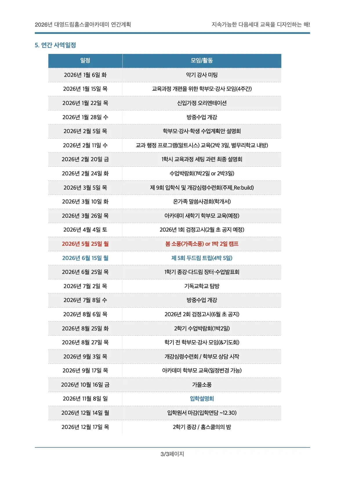 일정 안내: 방학 중 모임, 입학식, 학사일정