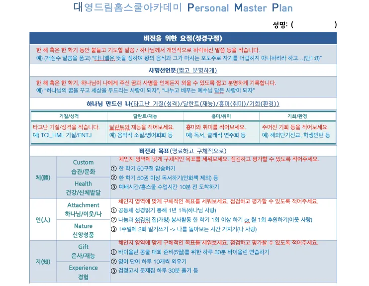홈스쿨 대심방 및 상담 시 마스터플랜을 반영해서 나눔을 가집니다.